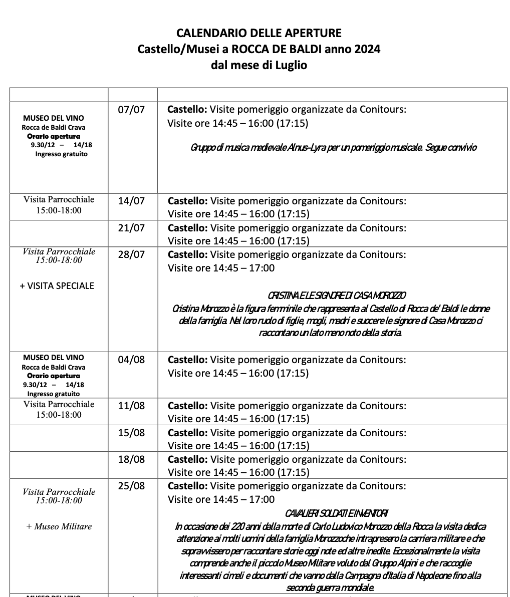 MUSEO DEL VINO – Rocca de Baldi Crava – Orario apertura9.30/12 – 14/18 – Ingresso gratuito